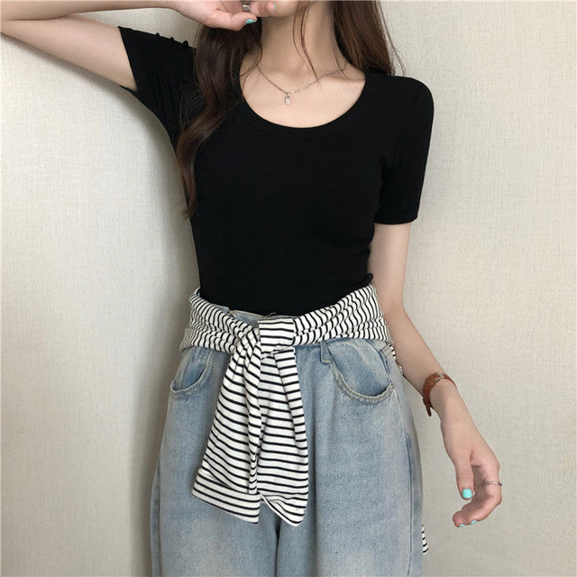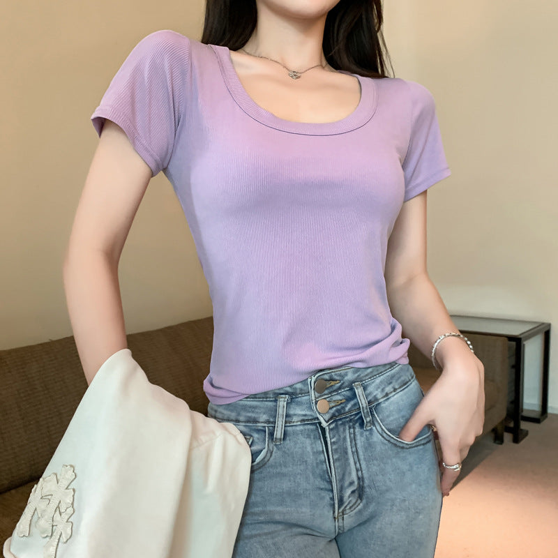Sexy U-neck Short Sleeve Ribbed Knit T Shirt for Women Summer Solid Bodycon Cute Baby Tee Crop Top Club Tank Tops Y2K Clothes