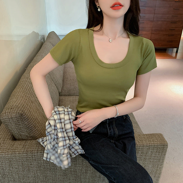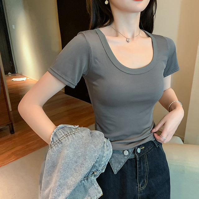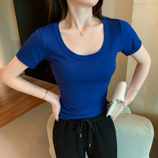 • Sexy U-neck Short Sleeve Ribbed Knit T Shirt for Women Summer Solid Bodycon Cute Baby Tee Crop Top Club Tank Tops Y2K Clothes